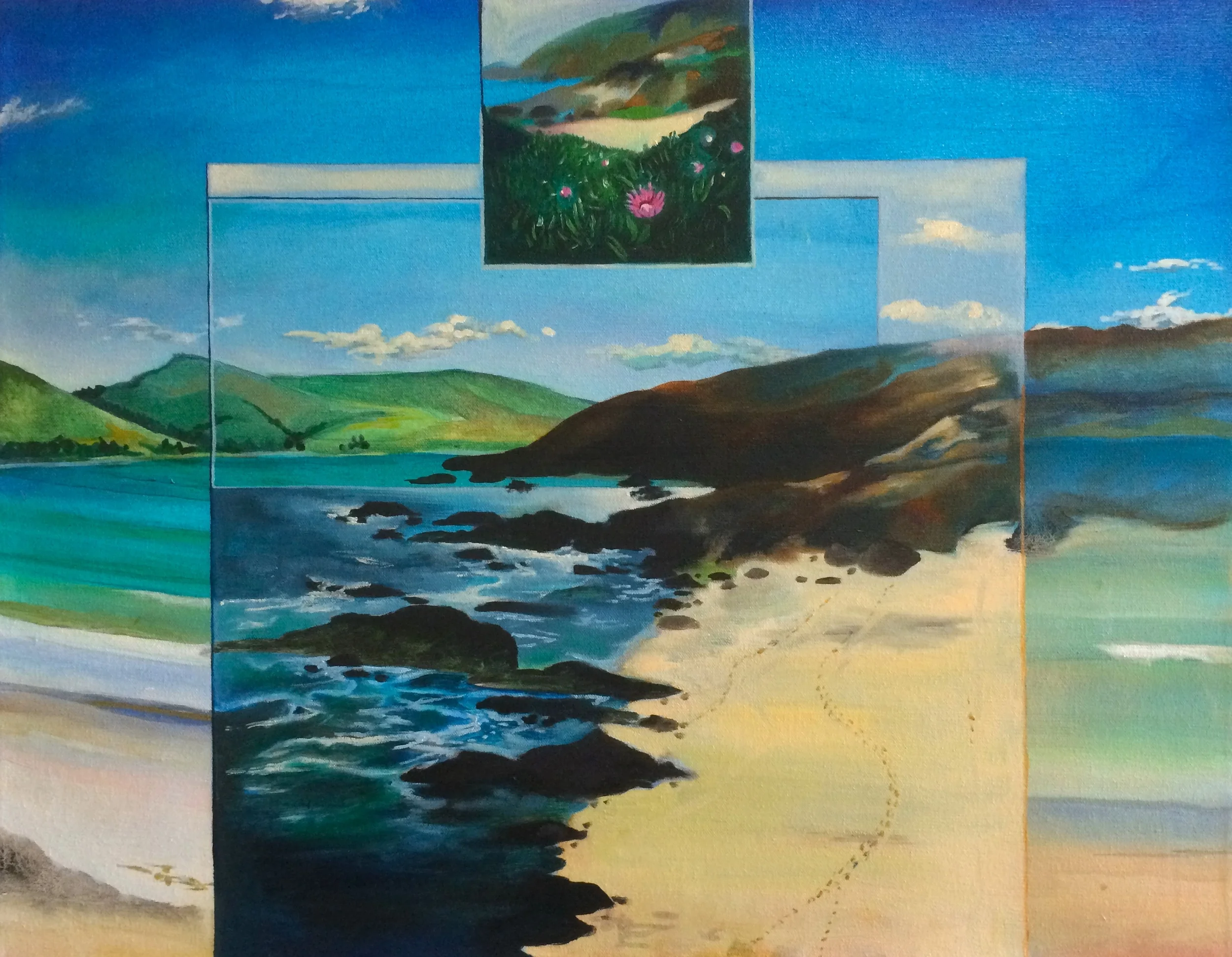 In March of 2013, I travelled to the Bay Area, and within a week, I found myself in the Red Wood Forest, on beaches and in bays, driving through the mountains, farms, wine country, and finally back in cosmopolitan San Francisco. The singletrip was a stream of various locations ultimately bleeding into a unique memory, a superimposition that was a feeling of the experience.